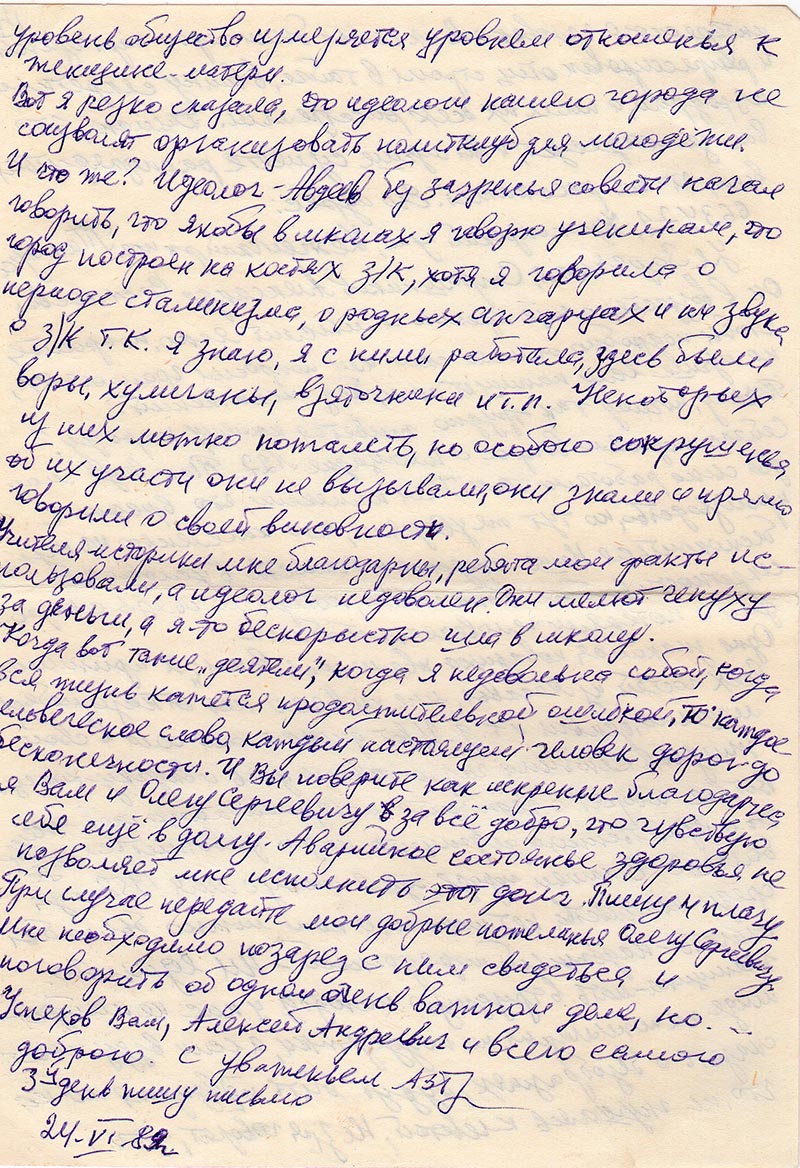 Вот я резко сказала, что идеологи нашего города не соизволят организовать политклуб для молодёжи. И что же? Идеолог – Авдеев без зазренья совести начал говорить, что якобы в школах я говорю ученикам, что город построен на костях з/к, хотя я говорила о периоде сталинизма, о родных ангарцах и ни звука о з/к т.к. я знаю, я с ними работала, здесь были воры, хулиганы, взяточники и т.п. Некоторых из них можно пожалеть, но особого сокрушенья об их участи они не вызывали, они знали и прямо говорили о своей виновности.