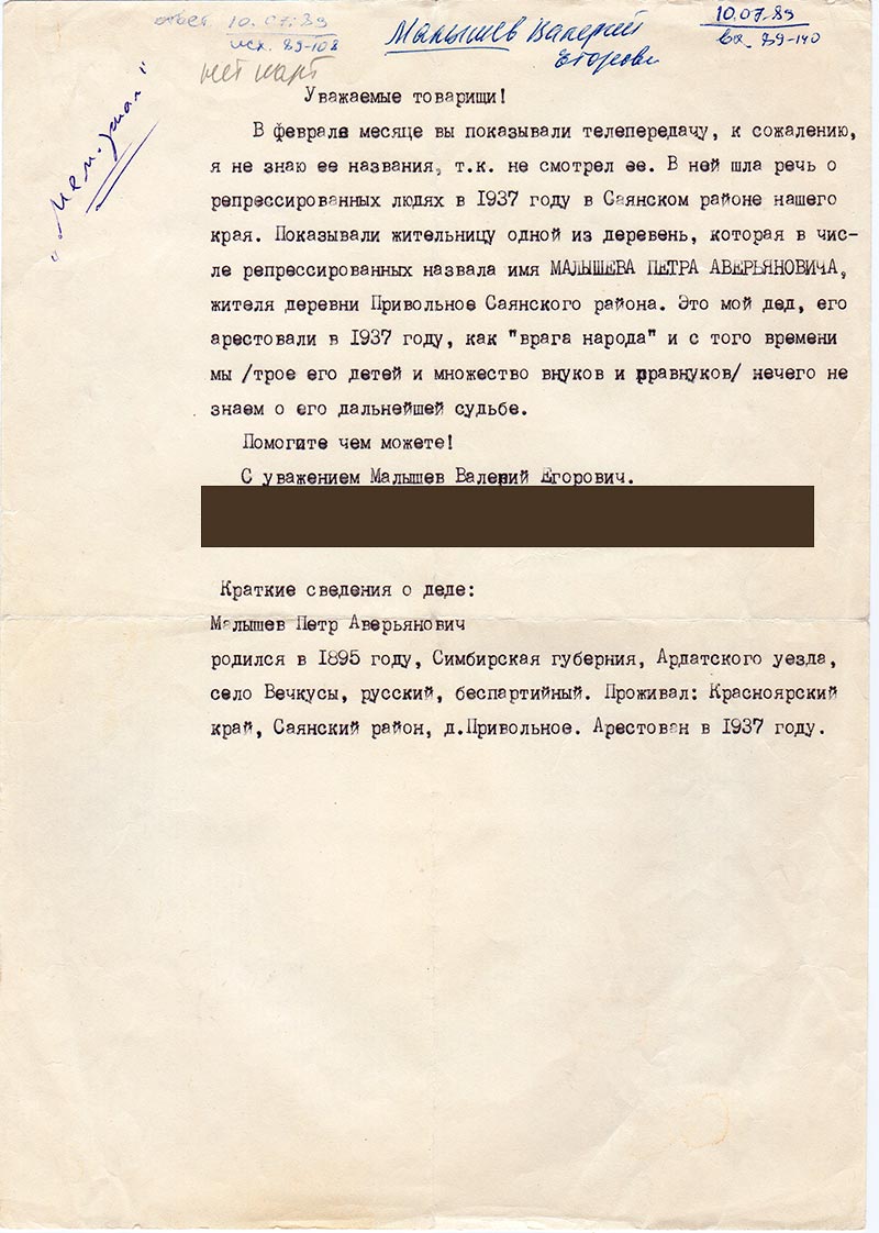В феврале месяце вы показывали телепередачу, к сожалению я не знаю ее названия, т.к. не смотрел её. В ней шла речь о репрессированных людях в 1937 году в Саянском районе нашего края. Показывали жительницу одной из деревень, которая в числе репрессированных назвала имя МАЛЫШЕВА ПЕТРА АВЕРЬЯНОВИЧА, жителя деревни Привольное Саянского района. Это мой дед, его арестовали в 1937 году, как «врага народа» и с того времени мы /трое его детей и множество внуков и правнуков/ нечего не знаем о его дальнейшей судьбе.
