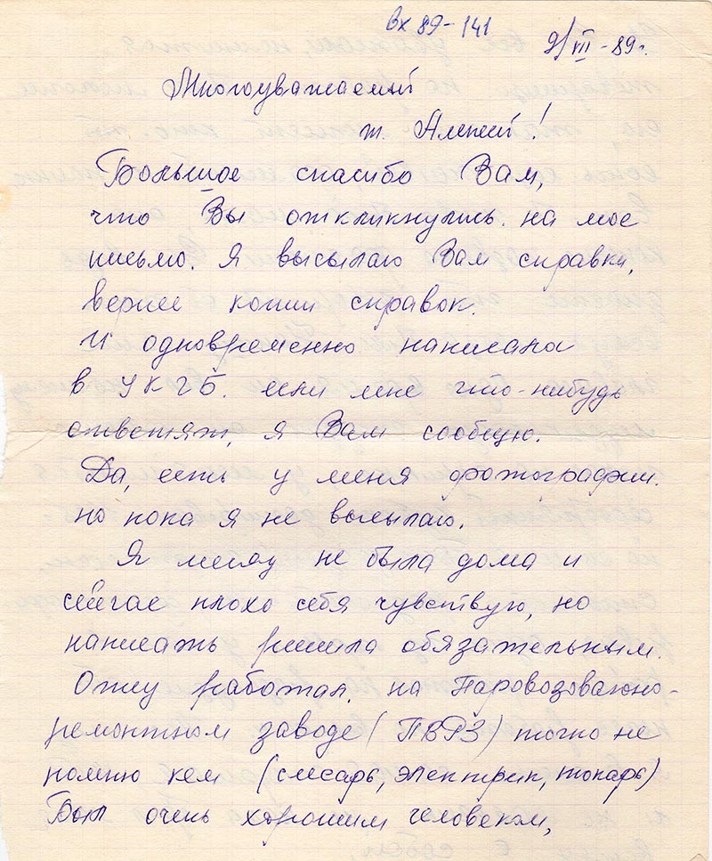 И одновременно написала в УКГБ. если мне что-нибудь ответят, я Вам сообщю.