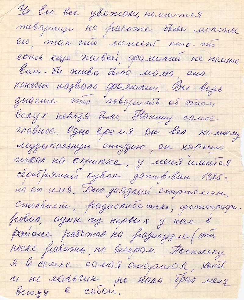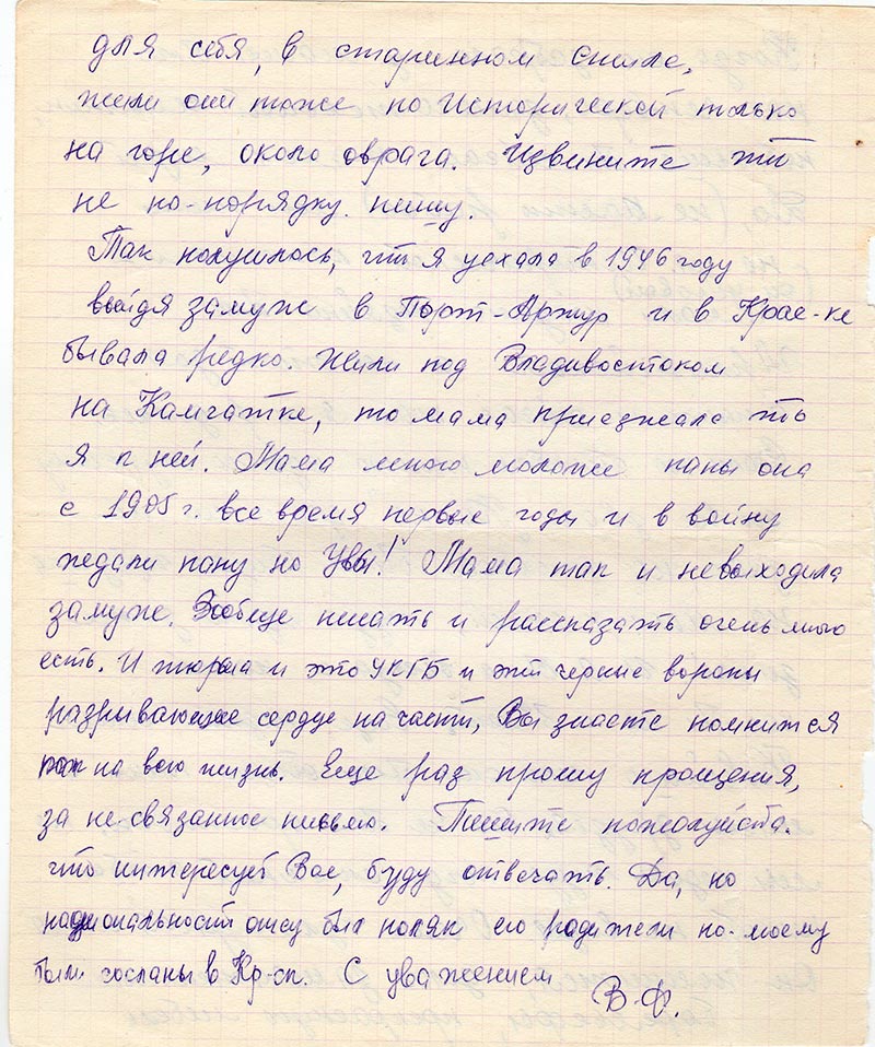 Так получилось, что я уехала в 1946 году выйдя замуж в Порт-Артур и в Крас-ке бывала редко. Жили под Владивостоком на Камчатке, то мама приезжала то я к ней. Мама много моложе папы она 1905 г. все время первые годы и в войну ждали папу но Увы! Мама так и невыходила замуж. Вообще писать и рассказать очень много есть. И тюрьма и это УКГБ и эти черные вронки разрывающие сердце на части, Вы знаете помнится как на всю жизнь. Еще раз прошу прощения, за несвязанное письмо. Пишите пожалуйста. Что интересует Вас, буду отвечать. Да, по национальности отец был поляк его родители по-моему были сосланы в Кр-ск. С уважением