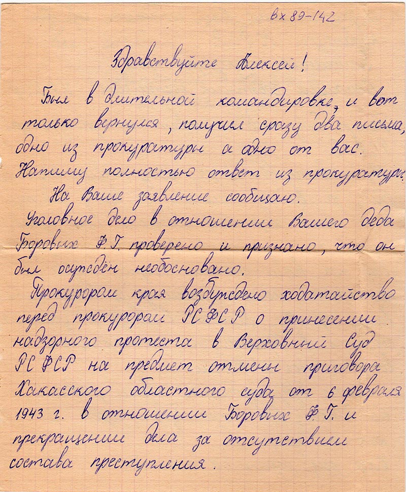 Уголовное дело в отношении Вашего деда Боровых Ф.Г. проверено и признано, что он