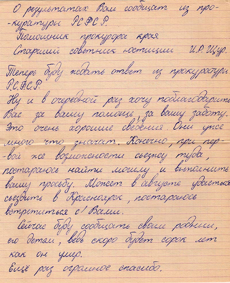 Ну и в очередной раз хочу поблагодарить Вас за вашу помощь, за вашу заботу. Это очень хорошие сведения. Они уже много что значат. Конечно, при первой же возможности съезжу туда, постараюсь найти могилу и выполнить вашу просьбу. Может в августе удасться сьездить в Красноярск, постараюсь встретиться с Вами.