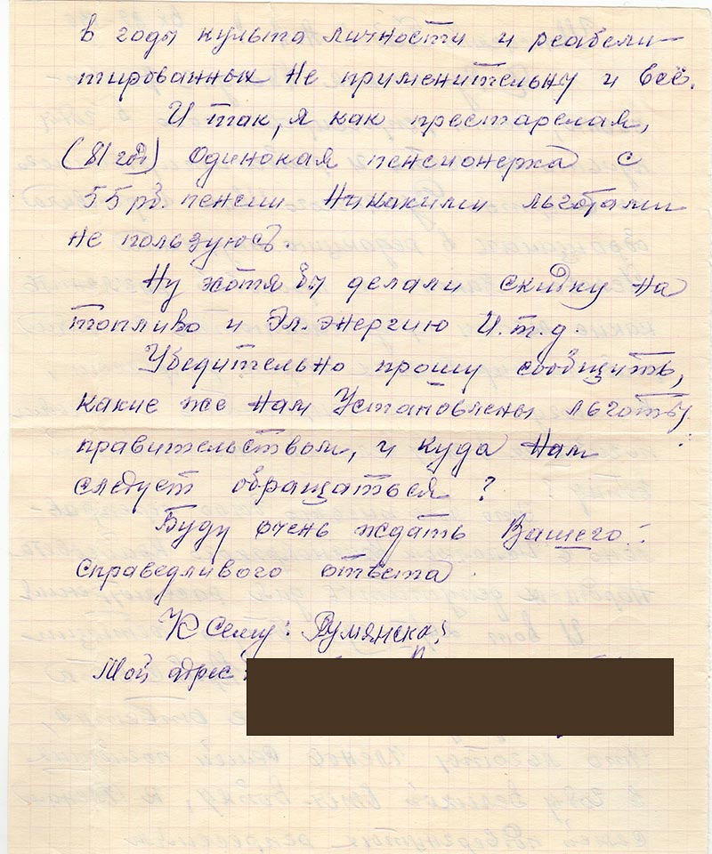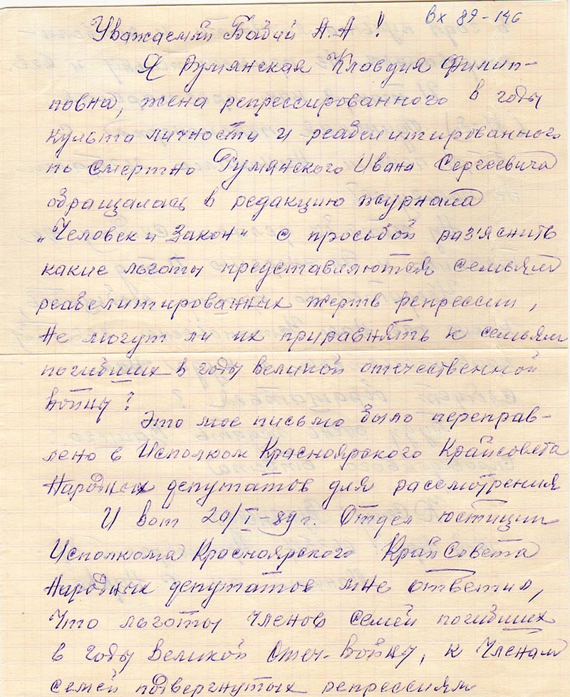 Я Румянская Клавдия Филипповна, жена репрессированного в годы культа личности и реабилитированного по смертно Румянского Ивана Сергеевича обращалась в редакцию журнала «Человек и Закон» с просьбой разʹяснить какие льготы представляются семьям реабилитированных жертв репрессии.