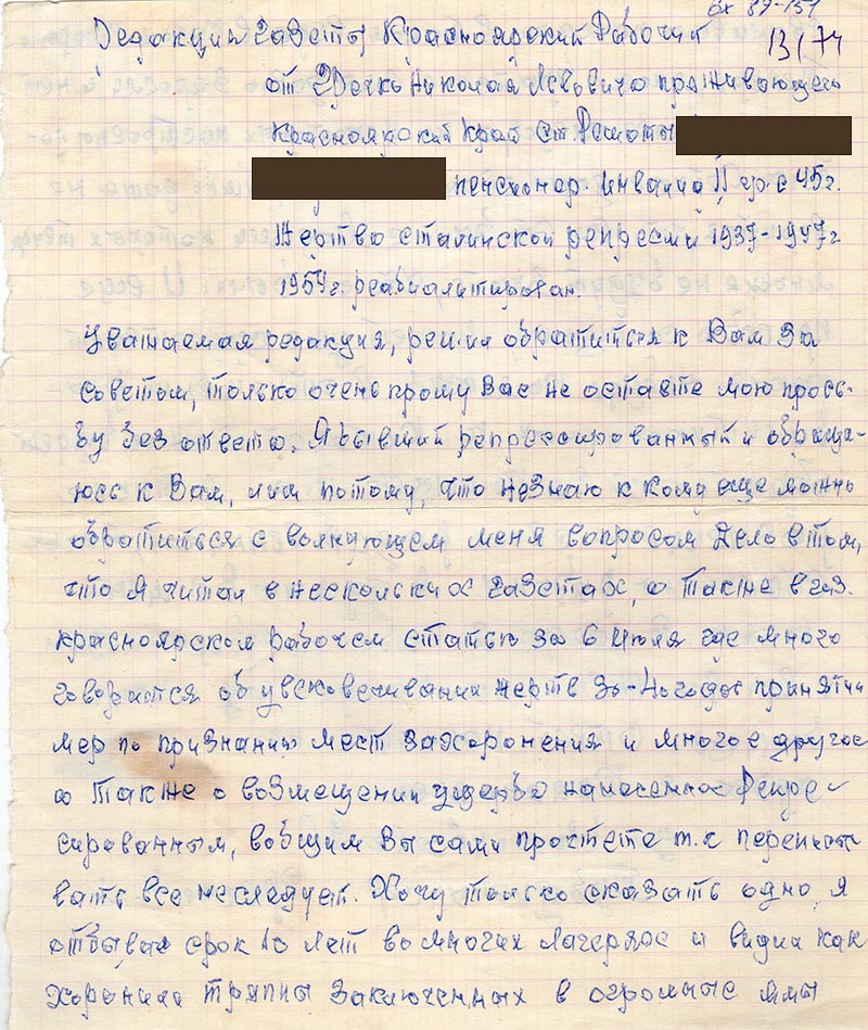 Уважаемая редакция, решил обратиться к Вам за советом, только очень прошу Вас не оставьте мою просьбу без ответа. Я бывший репрессированный и обращаюсь к Вам, или потому, что незнаю к кому еще можно обратиться с волнующем меня вопросом. Дело в том, что я читал в нескольких газетах, а также в газ. Красноярском рабочем статью за 6 июля где много говориться об увековечивании жертв 36-40 годов принятии мер по признанию мест захоронения и многое другое а также о возмещении ущерба нанесенного репрессированным, вобщем Вы сами прочтете т.к. переписывать все не следует. Хочу только сказать одно, я отбывал срок 10 во многих лагерях и видел как хоронили трупы заключенных в огромные ямы сваливали пачками в таком виде в каком умирали. Теперь, многие братские ямы давно заросли и нет уже никаких следов, а на некоторых построены поселки. Сейчас даже становится страшно, даже не верится, что все это было с людьми которых теперь многие не будут знать, что они были. И еще просьба сообщите, может уже существует какая-нибудь комиссия в отношении реабилитированных к которой можно будет обратиться за помощью т.к. я также разыскиваю своих родственников, также Сталинской работы. Я думаю вы меня поняли. В лагере я заболел туберкулезом и вот всю жизнь почти каждый год лечусь в больнице.
