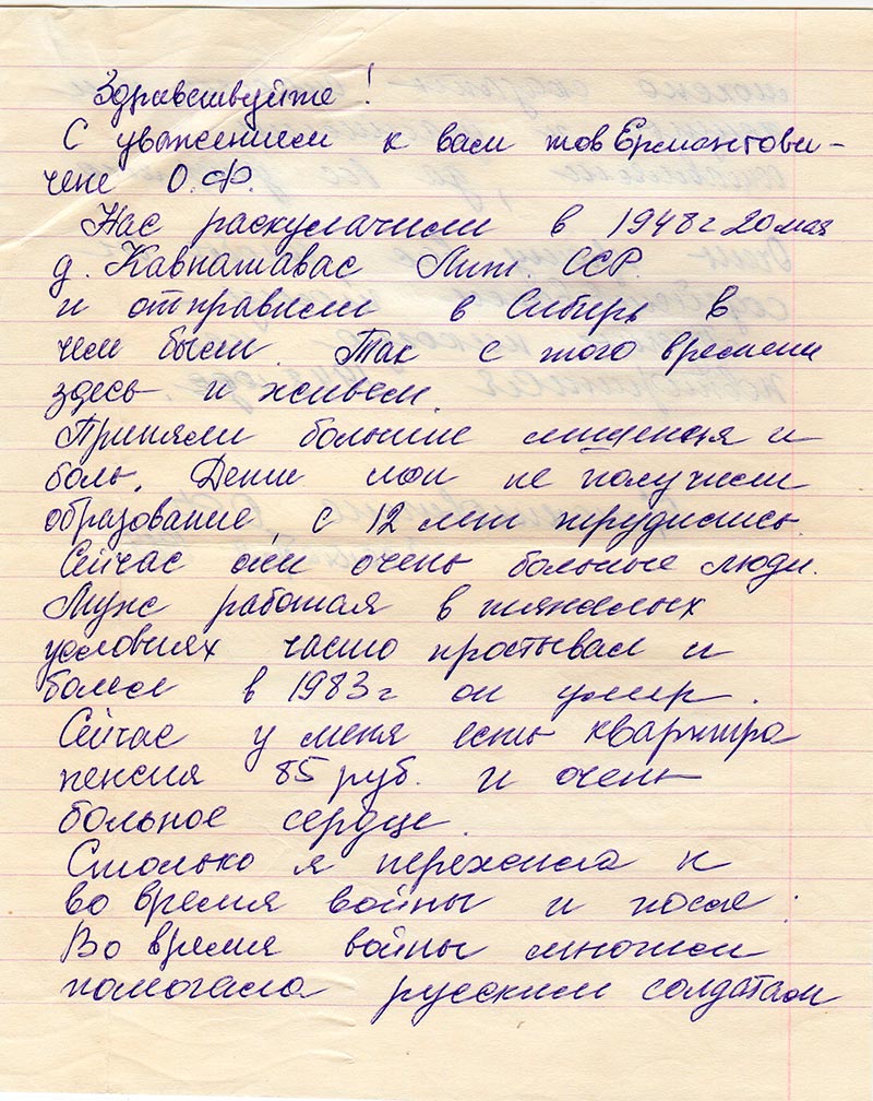 Нас раскулачили в 1948 г. 20 мая д. Кавнашавас Лит. ССР и отправили в Сибирь в чем были. Так с того времени здесь и живем.