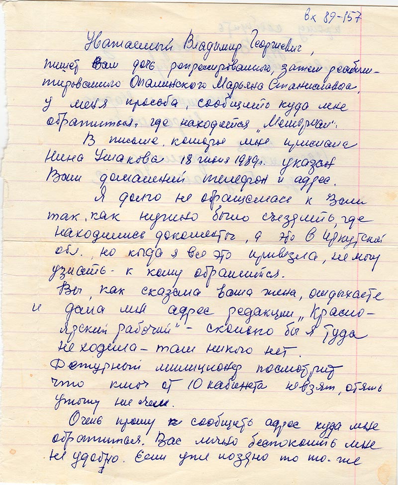 пишет Вам дочь репрессированного, затем реабилитированного Опалинского Марьяна Станиславна (может добавить ФИО репрессированного отца). У меня просьба, сообщить куда мне обратиться, где находится «Мемориал».