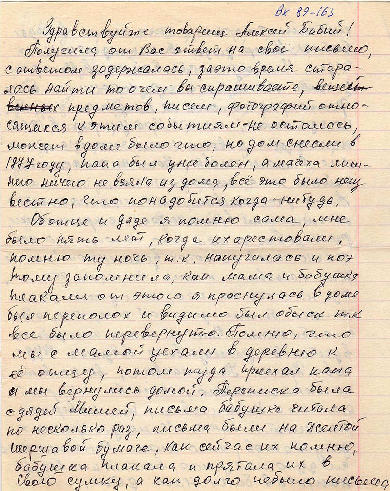 Об отце и дяде я помню сама, мне было пять лет, когда их арестовали, помню ту ночь, т.к. напугалась и поэтому запомнила, как мама и бабушка плакали от этого я проснулась в доме был переполох и видимо был обыск т.к. все было перевернуто. Помню, что мы с мамой уехали в деревню к её отцу, потом туда приехал папа и мы вернулись домой. Переписка быда с дядей Мишей, письма бабушке читала по несколько раз, письма были на желтой шершавой бумаге, как сейчас их помню, бабушка плакала и прятала их свою сумку, а как долго не было письма читали старые, это было в годы войны. Умер дядя в пятидесятые годы. К нему после войны в Магадан уехала жена, она его хоронила была фотография - она на кладбище у гроба, но где она, тетя Ира умерла в 1960 г жила она у своего племянника фамилия Саломатовы. Вот пыталась их найти пока безрезультатно.