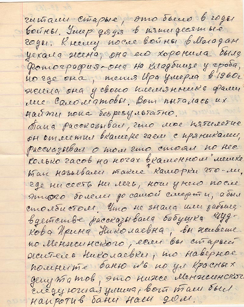 Папа рассказывал, что мое пятилетие он отметил в камере чаем с пряниками, рассказывал о том что стоял по несколько часов на ногах в «каменном» мешке так называли такие каморки что-ли, где ни сесть ни лечь, ноги у него после этого болели до самой смерти, а был столбистом. Что не знала или забыла в детстве рассказывала бабушка Чудкова Ирина Николаевна, вы живете по Менжинского, если вы старый житель Николаевки, то, наверное помните баню № 6 по ул. Красных депутатов, это ниже Менжинского следующая улица вот там был напротив бани наш дом.
