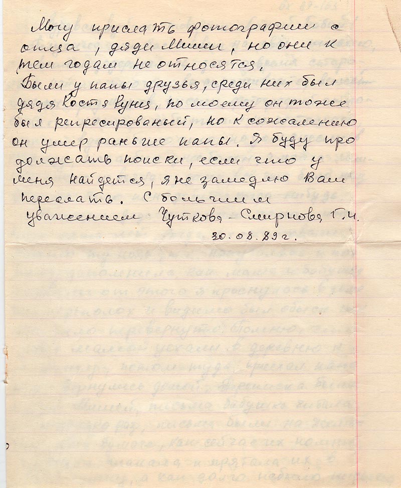 Получила от Вас ответ на своё письмо, с ответом задержалась, за это время старалась найти то о чем вы спрашиваете, вещей, предметов, писем, фотографий относящихся к этим событиям - не осталось, может в доме было что, но дом снесли в 1977 году папа был уже болен, а мачеха лишнего ничего не взяла из дома, всё это было неизвестно, что понадобится когда-нибудь.