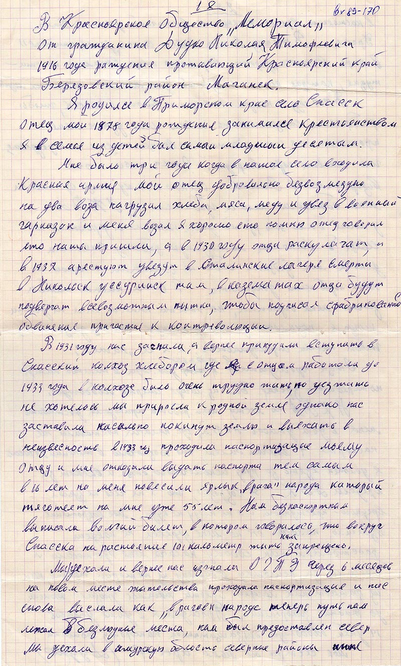 В Красноярское общество «Мемориал» от гражданина Дудко Николая Тимофеевича 1916 года раждения проживающий Красноярский край Березовский район Маганск.