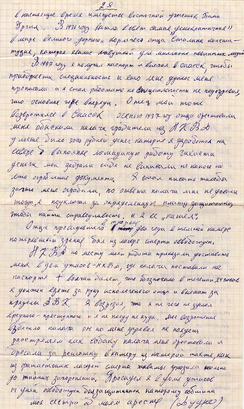 В 1937 году я получил паспорт и выехал в Спасск, чтобы приобрести спецыальность и ето мне удалос меня прописали и я стал работать по спецыальности не подозревая, что основное горе впереди. Отец мой тоже возвротился в Спасск. Осенью 1937 год отца орестовали меня обыскали палачи грабители из НКВД у меня было 3000 рублей денег каторые я зароботол на севере выполняе лошадиную работу чикисти деньги мои забрали сибе не выписали не какого на ето огробление документа. Я стал писать жалобы за что меня ограбили, но ответа палачи мне не довали тогда, я подключал за определенную плату защитника, чтобы найти справедливость, и я ее «нашел».