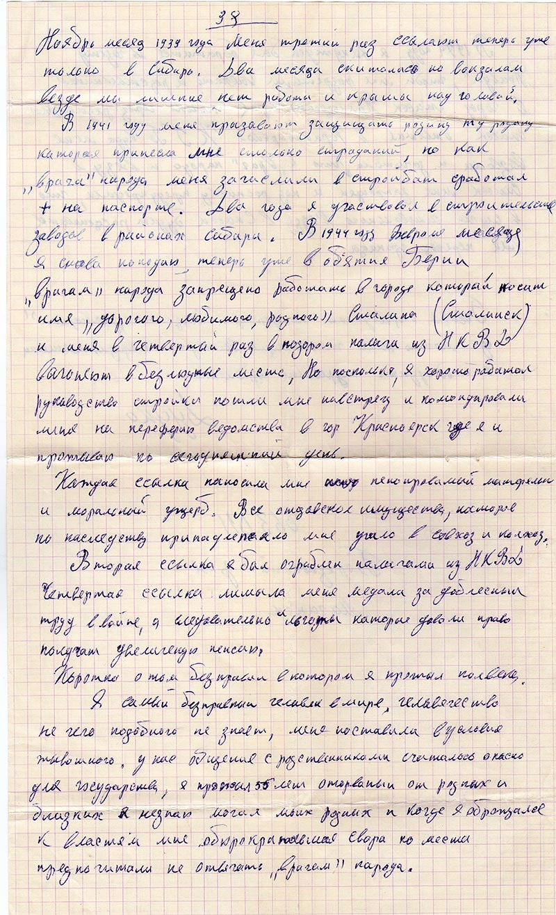 В 1941 году меня прызавают защищать родину ту родину каторая принесла мне столько страданий, но как «врага» народа меня зачислили в стройбат сработал + на паспорте. Два года я участвовал в строительстве заводов в районах Сибири. В 1944 году февраля месяце я снова поподаю теперь уже в обятия Берии «врагам» народа запрещено работать в городе который носит имя «дорогого, любимого, родного» Сталина (Сталинск) и меня в четвертый раз в позором палачи из НКВД выгоняют в безлюдные места. Но посколько я хорошо работал руководство стройки пошли мне на встречу и комондировали на переферию ведомства в гор Красноярск где я и прожываю по сегодняшний день.
