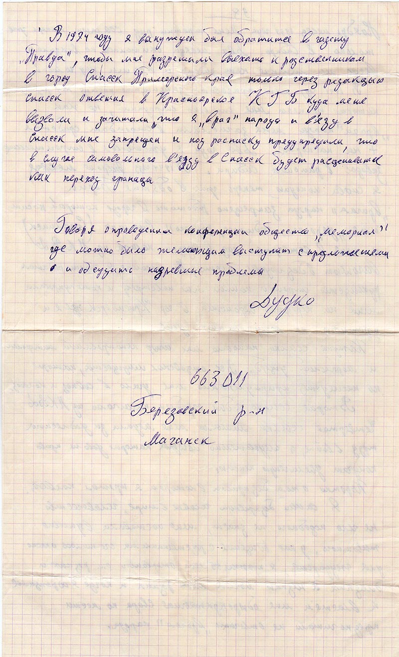 В 1974 году я вынужден был обратится в газету «Правда», чтобы мне разрешили выехать к родственникам в город Спасск Приморского края только через редакцыю Спасск ответил в Красноярское КГБ куда меня вызволи и зачитали,что я «враг» народа и в,езд в Спасск мне запрещен и под расписку предупредили, что в случае самовольного в,езду в Спасск будет расцениватся как переход границы.