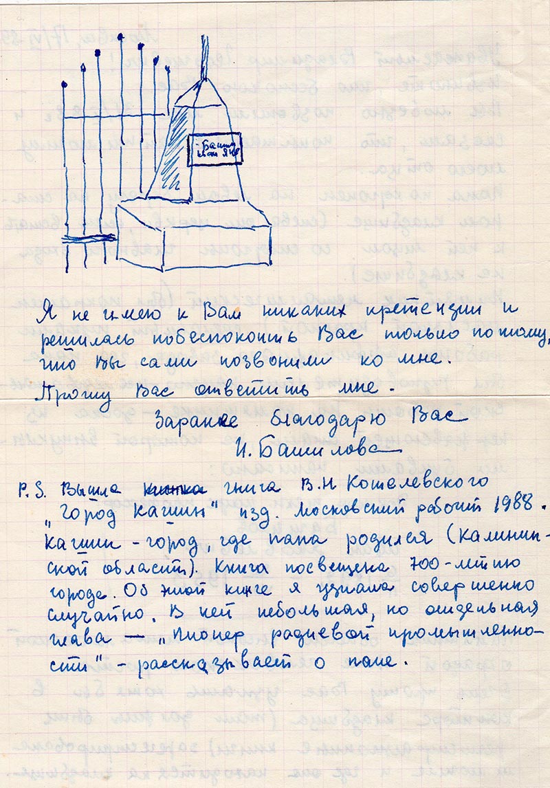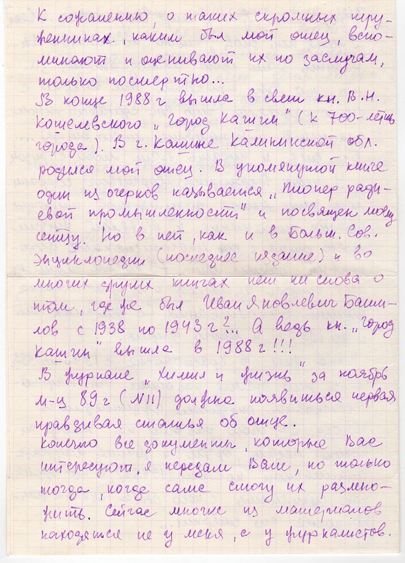 P.S. Вышла гнига В.Н. Кошелевского «Город Кашин» изд. Московский рабочий 1988. Кашин – город, где папа родился (Калининской области). Книга посвещена 700-летию города. Об этой книге я узнала совершенно случайно. В ней небольшая, но отдельная глава – «пионер радиевой промышленности» - рассказывает о папе.