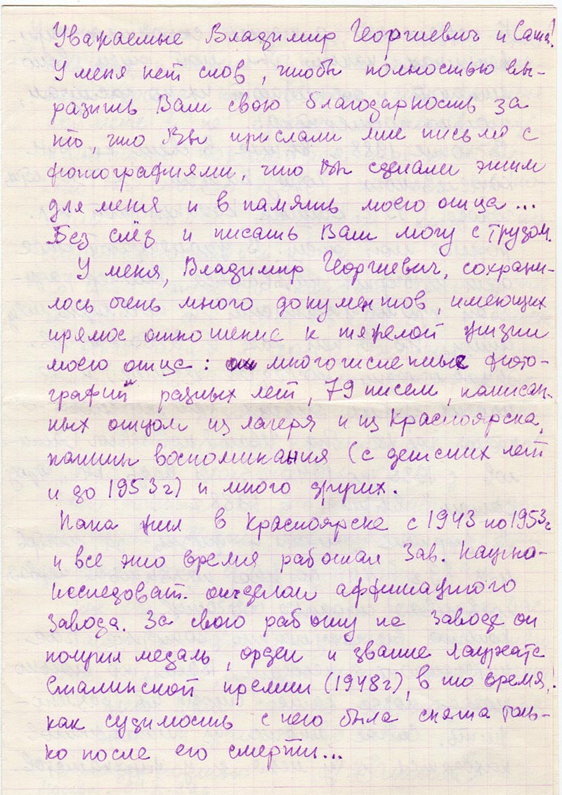 У меня, Владимир Георгиевич, сохранилось очень много документов, имеющих прямое отношение к тяжелой жизни моего отца: многочисленные фотографии разных лет, 79 писем, написанных отцом из лагеря и из Красноярска, папины воспоминания (с детских лет и до 1953 г) и много других.
