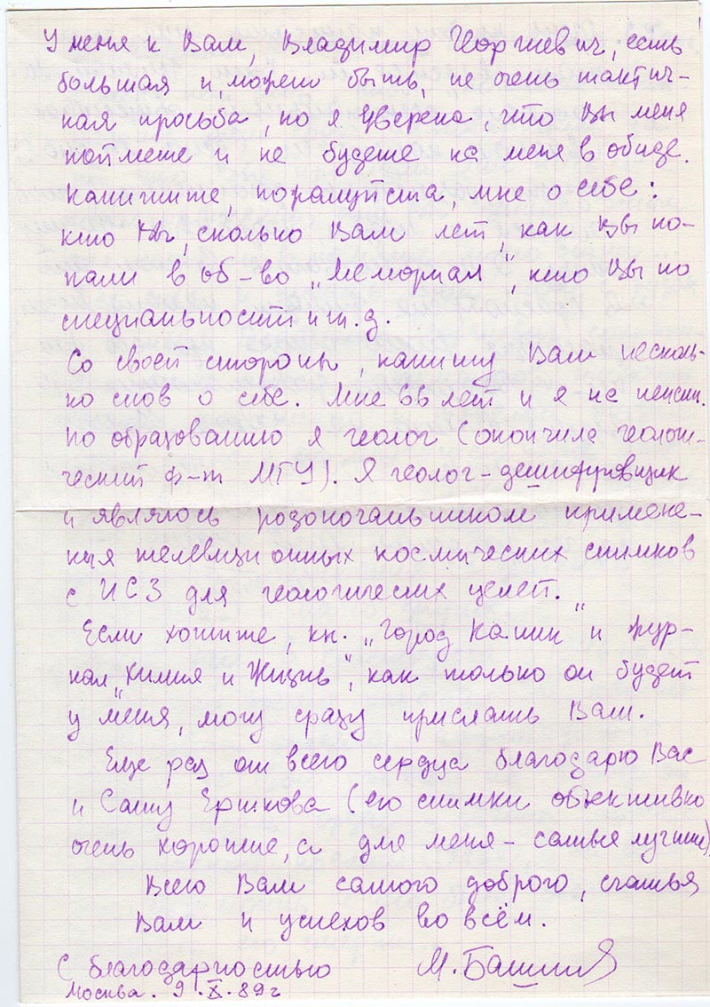 У меня к Вам, Владимир Георгиевич, есть большая и, может быть, не очень тактичная просьба, но я уверена, что Вы меня поймете и не будете на меня в обиде. Напишите, пожалуйста, о себе: кто Вы, сколько Вам лет, как Вы попали в об-во «Мемориал», кто Вы по специальности и т.д.