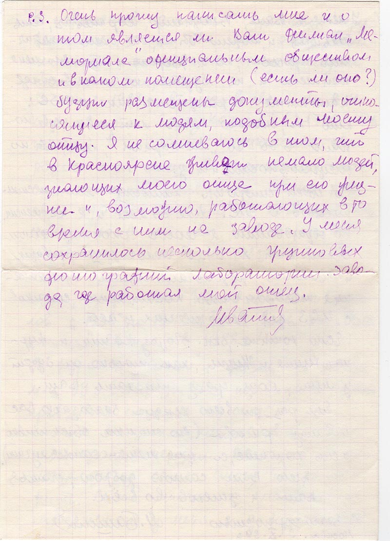 P.S. Очень прошу написать мне и о том является ли Ваш филиал «Мемориала»