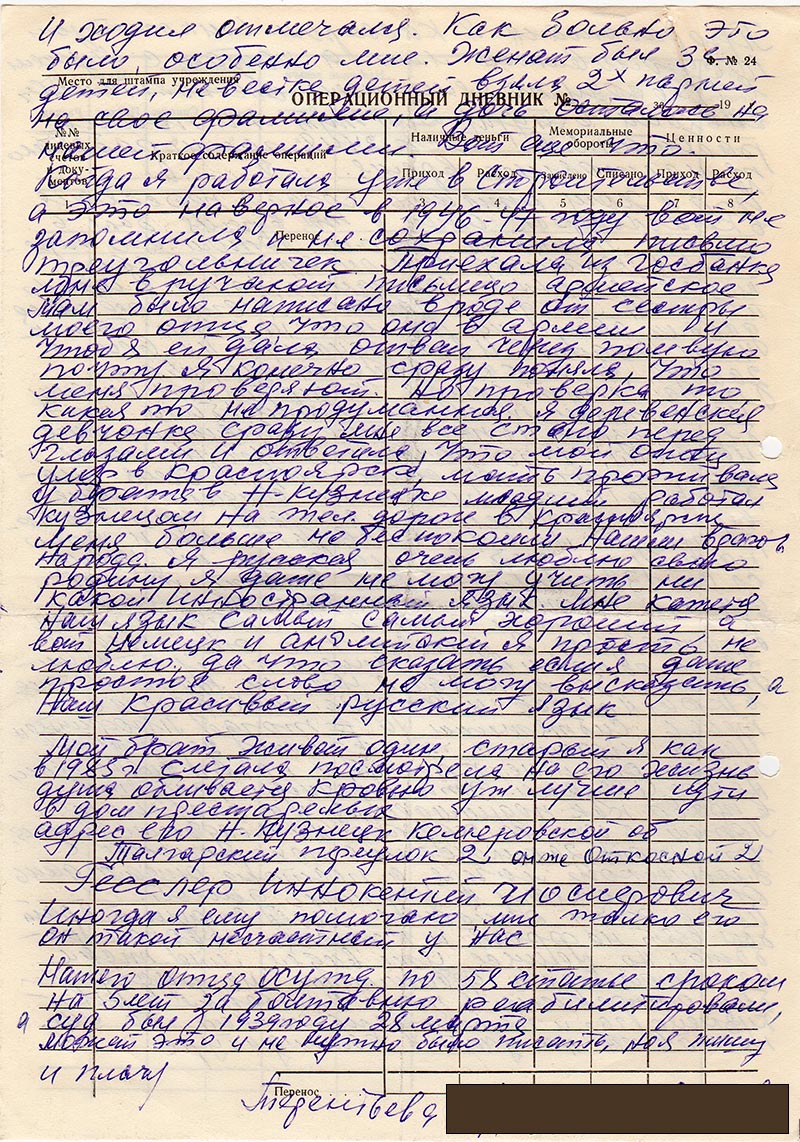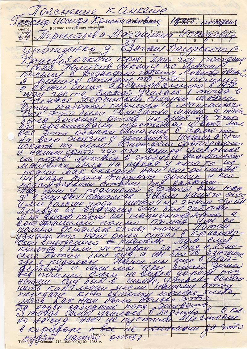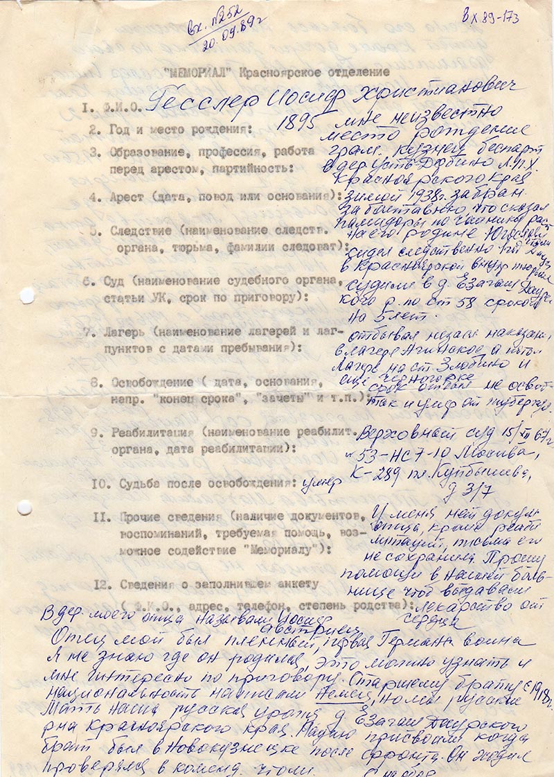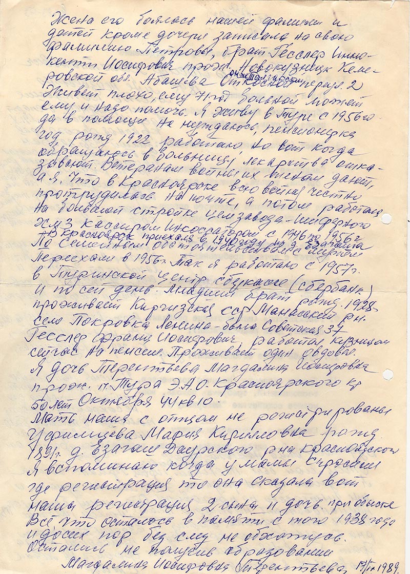 Жена его боялась нашей фамилии и детей кроме дочери записала на свою фамилию Петровы, брат Гесслер Иннокенти Иосифович прож. Новокузнецк Кемеровской обл. адрес. Живет плохо, ему 71 год больной может ему и надо помочь. Я живу в Туре с 1956го да в помощи не нуждаюсь, пенсионерка год рожд. 1922 работаю, но вот когда обращаюсь в больницу лекарства отказывают. Ветеранам войны их женам дают, а я, что в Красноярске всю войну честно протрудилась на почте, а потом работала на большой стройке цемзавода-шиферного ХМЗ кассиром инкоссатором с 1946 по 1956 г. По семейным обстоятельствам с мужем Переехали в 1956г. Так я работаю с 1957 г. в Туринской центр сберкассе (сбербанк) и по сей день. Младший брат рожд. 1928 г проживает Киргизская ССР Манасский рн. адрес. Гесслер Франц Иосифович, работал кузнецом сейчас на пенсии. Проживает один овдовел. Я дочь Терентьева Магдалина Иосифовна прож. п. Тура Э.А.О. Красоярского кр. адрес.