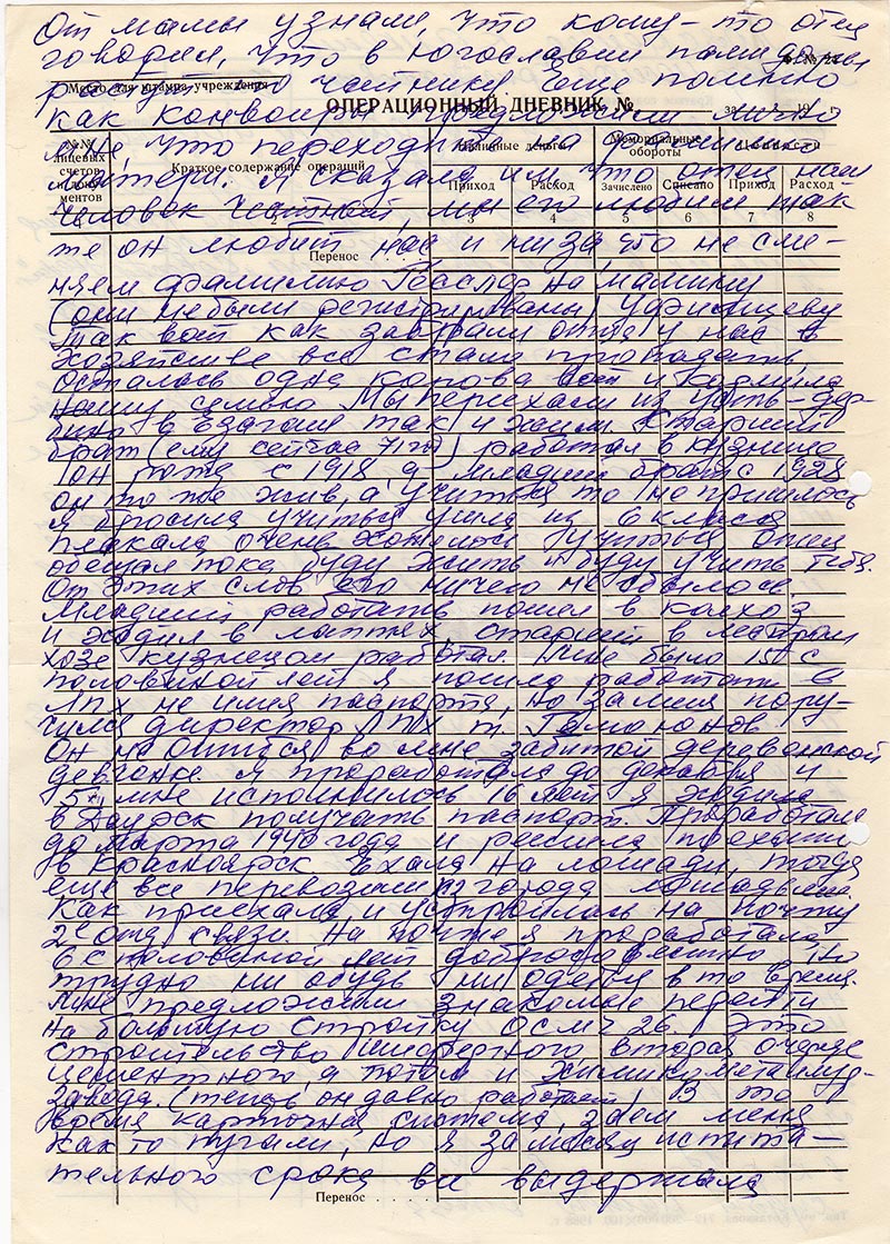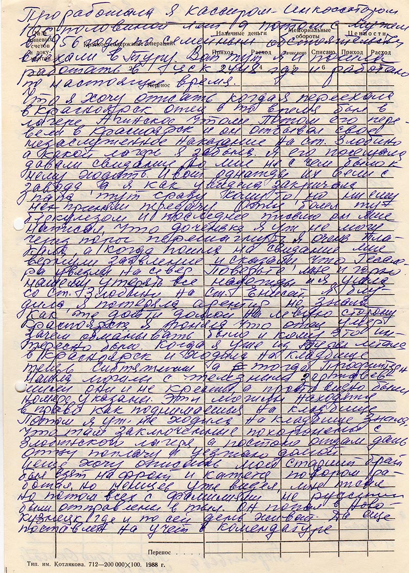 Правда из Езагаша еще был забран. Я не знаю какой он национальности а вот фамилию помню Охман, имя не помню. Осталась семья тоже. Потом узнали, что наш отец сидел в Красноярской внутренней тюрьме. Там ему конечно было не сладко за 1 год и 2 месяца. Потом был суд, он был в Езагаше где я родилась. Жили мы еще в Усть-дербино и шли мы через Енисей зимой все помню, слезы не видев дороги под ногами. Суд был в школе, ужасно вспомнить как люди несли нашему отцу передачи кто бутылку молока, хлеба, мяса. Как нам было больно это. Да разве забудешь пока живешь. Я тогда еще училась в Дербино в 6 кл. но на суд нас не пустили. Мы стояли в коридоре и все не понимали за что судят нашего отца. От мамы узнали, что кому-то отец говорил, что в Югославии памидоры растут по чайнику. Еще помню как конвоиры предложили лично мне, что переходите на фамилию матери. Я сказала им, что отец наш человек честный, мы его любим так же он любит нас и на за что не сменяем фамилию Гесслер на мамину (они не были регистрированы) Уфимцеву. Так вот как забрали отца у нас в хозяйстве все стало пропадать, осталась одна корова вот и кормила нашу семью. Мы переехали из Усть-дербино в Езагаш так и жили. Старший брат (ему сейчас 71 год) работал в кузнице. Он тоже с 1918, а младший брат с 1928 он тоже жив, а учиться то не пришлось. Я бросила учиться ушла из 6 класса. Плакала очень хотелось учиться, отец обещал пока буду жить и буду учить тебя. От этих слов его ничего не сбылось. Младший работать пошел в колхоз и ходил в лаптях, старший в леспромхозе кузнецом работал. Мне было 15 с половиной лет я пошла работать в ЛПХ не имея паспорта, но за меня поручился директор ЛПХ т. Гамоюнов. Он не ошибся во мне забитой деревенской девчонке. Я проработала до декабря и 5 XII мне исполнилось 16 лет. Я ходила в Даурск получать паспорт. Проработала до марта 1940 года и решила поехать в Красноярск. Ехала на лошади, тогда еще все перевозили из города лошадьми. Как приехала и устроилась на почту 2-е отд. связи. На почте я проработала 6 с половиной лет добросовестно, но трудно ни одеться в то время. Мне предложили знакомые перейти на большую стройку ОСМЧ 26. Это строительство шиферного, вторая очередь цементного, а потом и химикометалур. завода. (теперь он давно работает). В то время карточная система, заем меня как-то пугали, но я за месяц испытательного срока все выдержала. Проработала я кассиром-инкоссатором 10 с половиной лет, а потом с мужем в 1956 году по семейным обстоятельствм выехали в Туру. Вот тут я и пошла работать в ЦСК 2448 где и работаю по настоящее время.