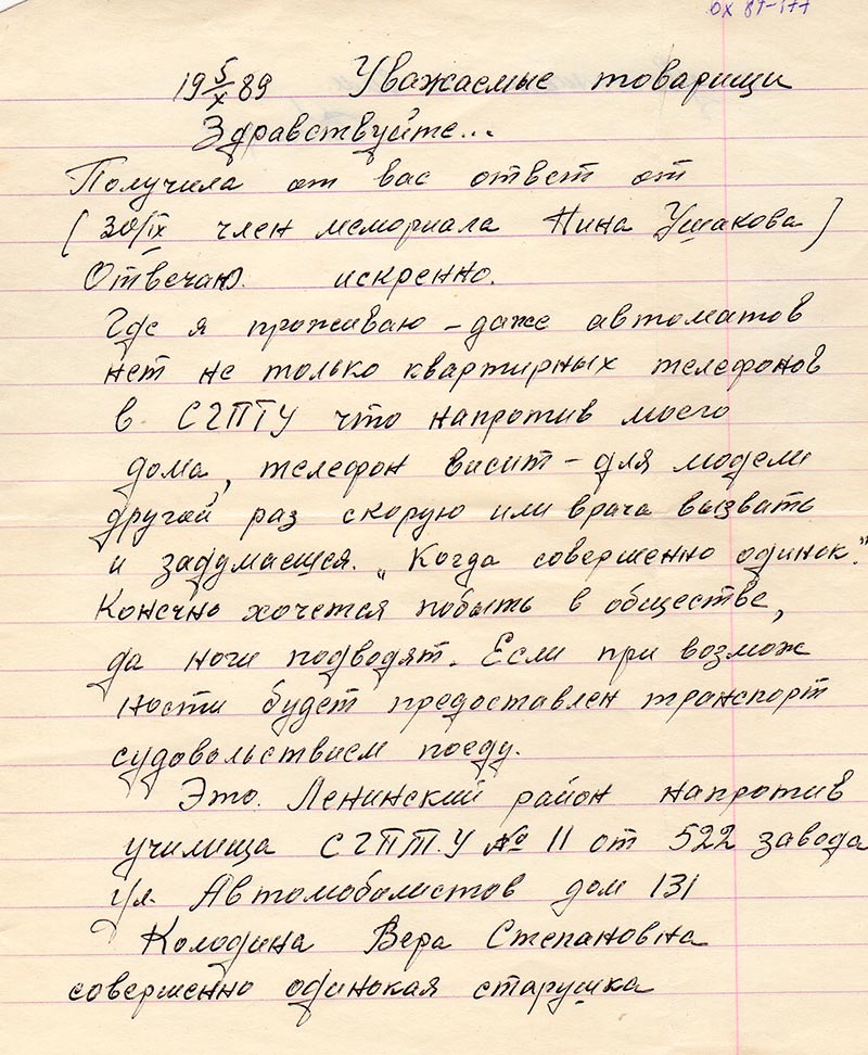 Получила от вас ответ от (30/IX член мемориала Нина Ушакова)