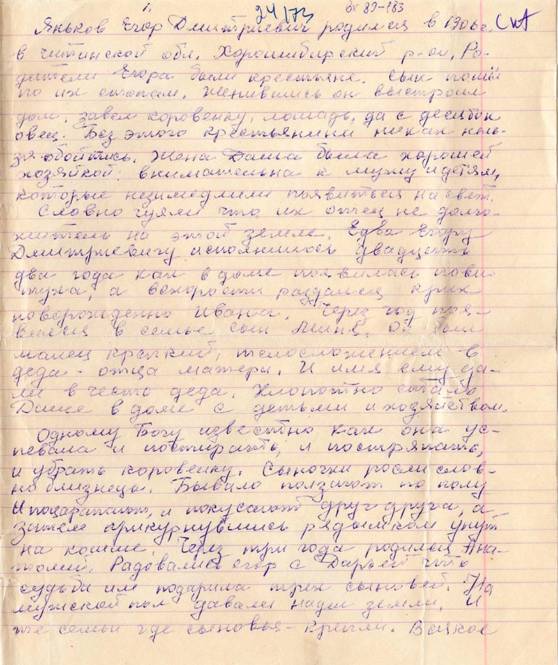 Яньков Егор Дмитриевич родился в 1906г. в Читинской обл. Хорошибирский р-он. Родители Егора были крестьяне. Сын пошел по их стопам. Женившись он выстроил дом, завел коровенку, лошадь, да с десяток овец. Без этого крестьянини никак нельзя обойтись. Жена Даша была хорошей хозяйкой: внимательна к мужу и детям, которые незамедлили появиться на свет.