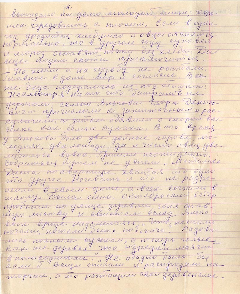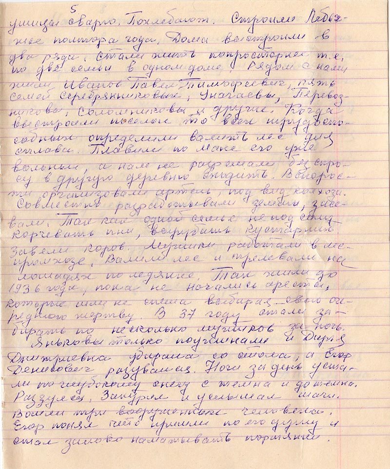Совместно разрабатывали земли, засевали. Так как одной семье не под силу корчевать пни, вырубать кустарник. Завели коров. Мужики работали в леспромхозе. Валили лес и трелевали на лошадях по ледянке. Так жили до 1936 года, пока не начались аресты. Которые шли не спеша выбирая свою очереднюю жертву. В 37 году стали забирать по несколько мужиков за ночь.