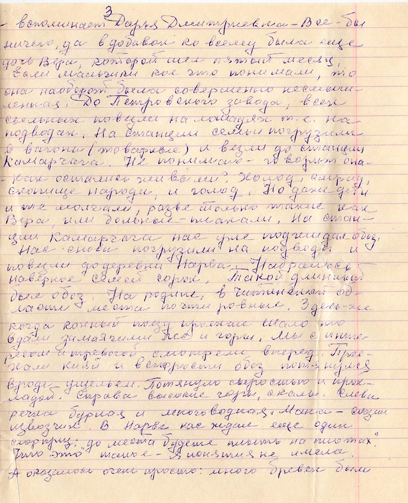 Если мальчики кое-что понимали, то она наоборот была совершенно несмышленная. До Петровского завода, всех сыльных повезли на лошадях т.е. на подводах. На станции семьи погрузили в вагоны (товарные) и везли до станции Камарчага. Не понимаю – говорит она – как остались живыми? Холод, смрад, скопище народа, и голод. Но даже дети и те молчали, разве только такие как Вера, или больные – плакали. На станции Камарчага нас уже поджидал обоз.