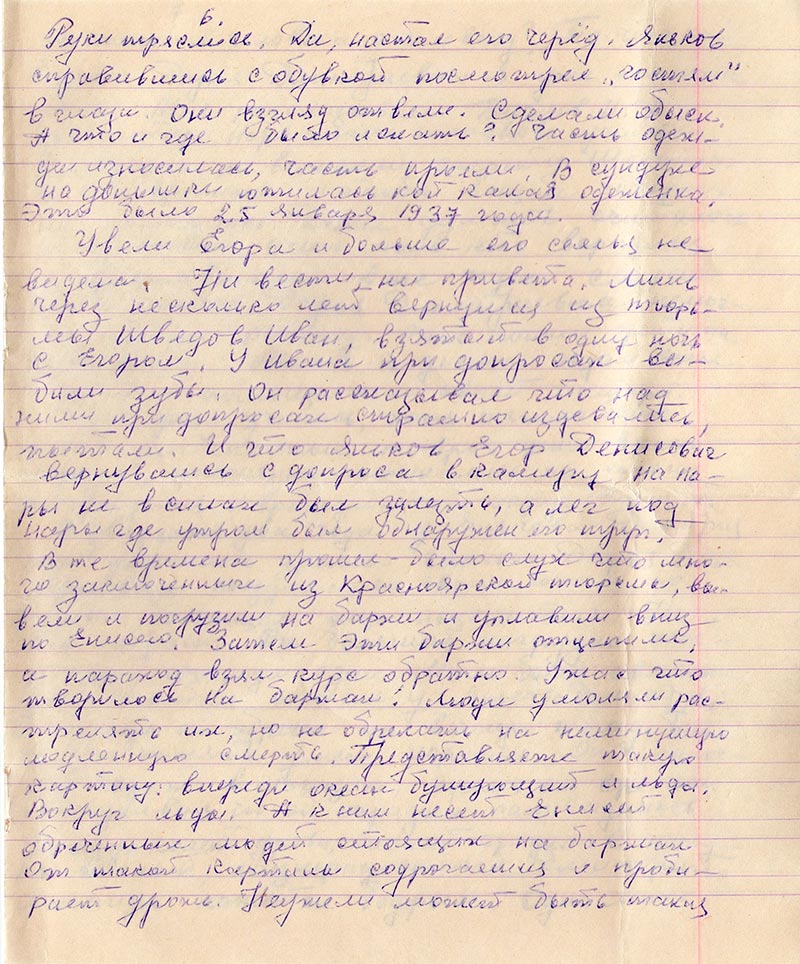 В те времена прошел – было слух что много заключенных из Красноярской тюрьмы, вывели и погрузили на баржи и уплавили вниз по Енисею. Затем эти баржи отцепили, а пароход взял курс обратно. Ужас что творилось на баржах. Люди умоляли растрелять их, но не обрекать на неминуемую медленную смерть. Представляете такую картину: впереди океан бушующий и льды. Вокруг льды. А к ним несет Енисей обреченных людей стоящих на баржах. От такой картины содрогаешся и прорает дрожь. Неужели может быть такая жестокость человека к человеку? То, что поведала Дарья Дмитриевна я уже слышала тоже. Мне рассказывал Бузуев Н.А. бухгалтер Нарвинского сплавного участка. Рассказывал по великому секрету. Шепотом. В те времена о таких вещах говорить не полагалось. Даже думать считалось кощунством. Очень мало кто вернулся из арестованных в те годы. Семьи жили плохо. Дарья Дмитриевна немогла найти работу. Рано пошли дети на свои хлеба. Митя к десяти годам стал хорошим помощником своей матери.