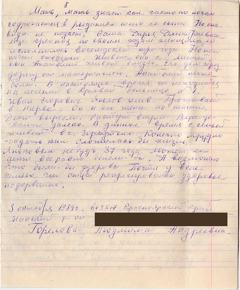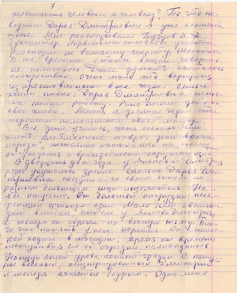 В двадцать два года у Янькова Дмитрия резко ухудшилось зрение. Сколько Дарья Дмитриевна поездила со своим сыном по разным больницам ища исцелителя. Но… все напрасно. От большой нагрузки неокрепший организм сдал. Мало было светлых дней в любом смысле у Янькова Дмитрия, а теперь он обречен на вечную тьму. Благо что память у него хорошая. Он с палочкой ходит в магазин, время от времени постукивая его об оградки палисадников. На ощупь колет дрова, копает грядки. С натуры веселый, жизнерадостный Дмитрий и теперь кажется бодрым. Одна лишь Мать знает как часто по ночам содрогается в рыданиях тело ее сына. Но она виду не подает. Сама Дарья Дмитриевна еще крепкая по своим годам женщина, ей исполнилось восемдесят три года. Но ноги почти отказалис. Живет она с Митей. Сын Анатолий живет близко. Его дом через дорогу от материнского. Анатолий тоже болен. В настоящее время он находится на лечении в Краевой больнице №1.