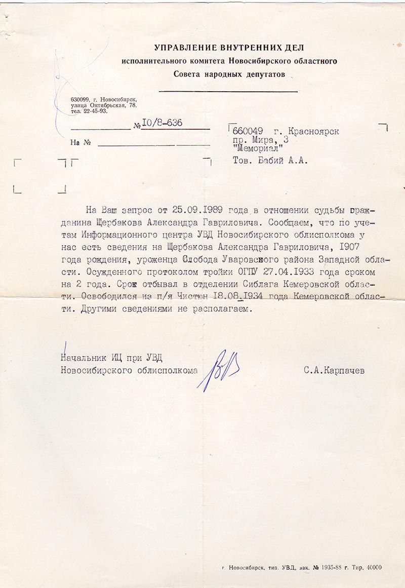 Сообщаю, что по Вашему запросу в отношении Щербакова А.Г. проведена проверка.