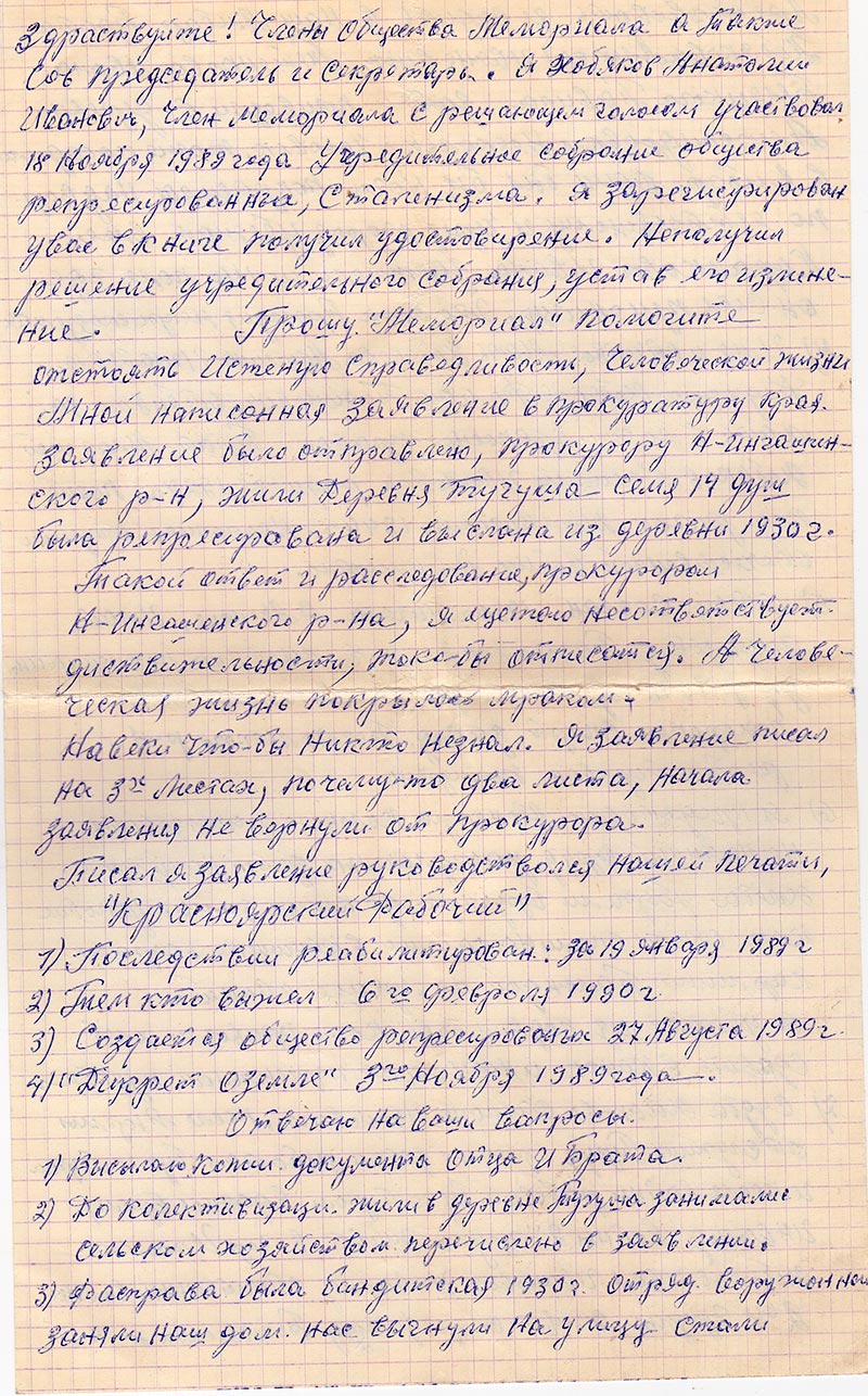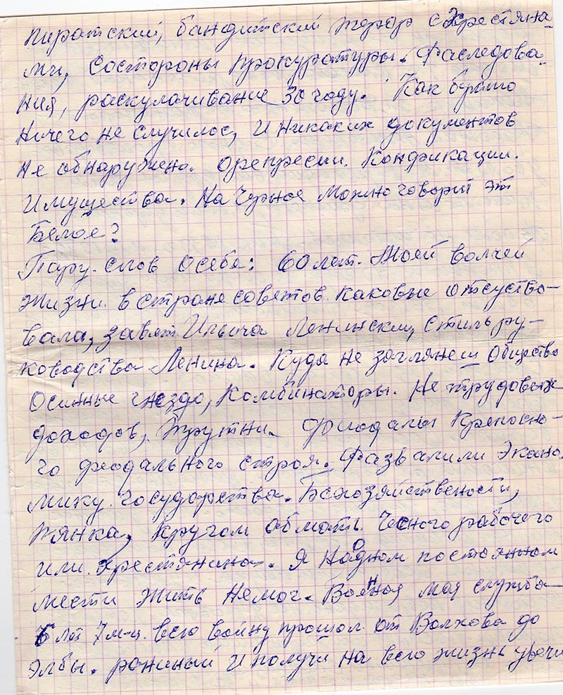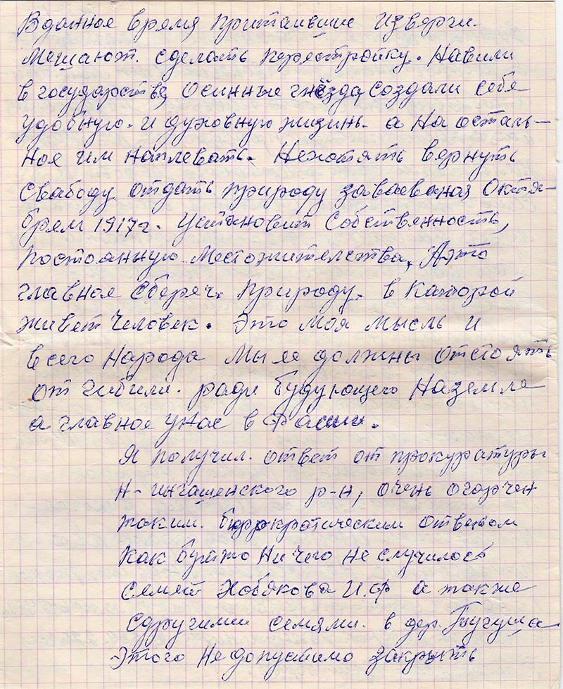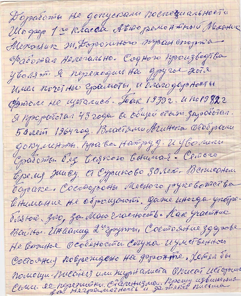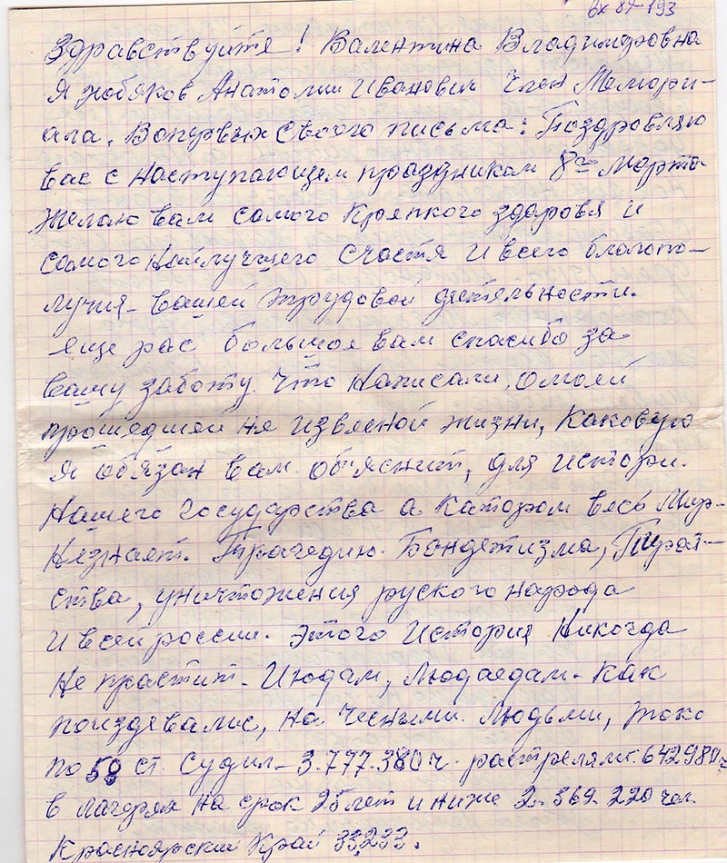 Вопервых своего письма: Поздравляю вас с наступающем праздником 8-го Марта. Желаю вам самого крепгого здоровья и самого наилучшего счастья и всего благополучия вашей трудовой деетельности. Еще рас большое вам спасибо за вашу заботу. Что написали о моей прошедшей не извесной жизни, каковую я обязан вам объяснит, для истории. Нашего государства а катором весь Мир – незнает. Трагедию. Бондетизма, Пиратства, уничтожения руского народа и всей россии. Этого История Никогда не прастит. Иродам, Людаедам. Как поиздевалис, на чесными людьми, токо по 58 ст. судил 3.777.380 ч. растреляли: 642980 ч. в лагерях на срок 25 лет и ниже 2.369.220 чел. Красноярский край 33.233.