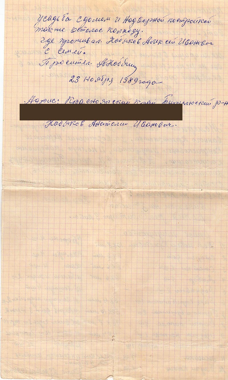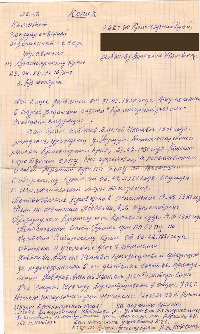 Ваш брат Хобяков Алексей Иванович 1906 года рождения, урожденец д.Тугуша Нижнеингашенского раиона Красноярского края, 27.07.1930 года Канским окротделом ОГПУ был арестован, а постановлением особой Троикой при ПП ОГПУ по Восточно Сибирскому Краю от 06.02.1931 года осужден к исключительной меры наказания.