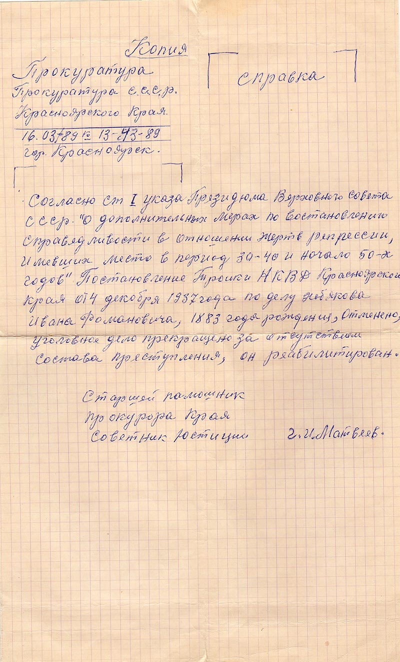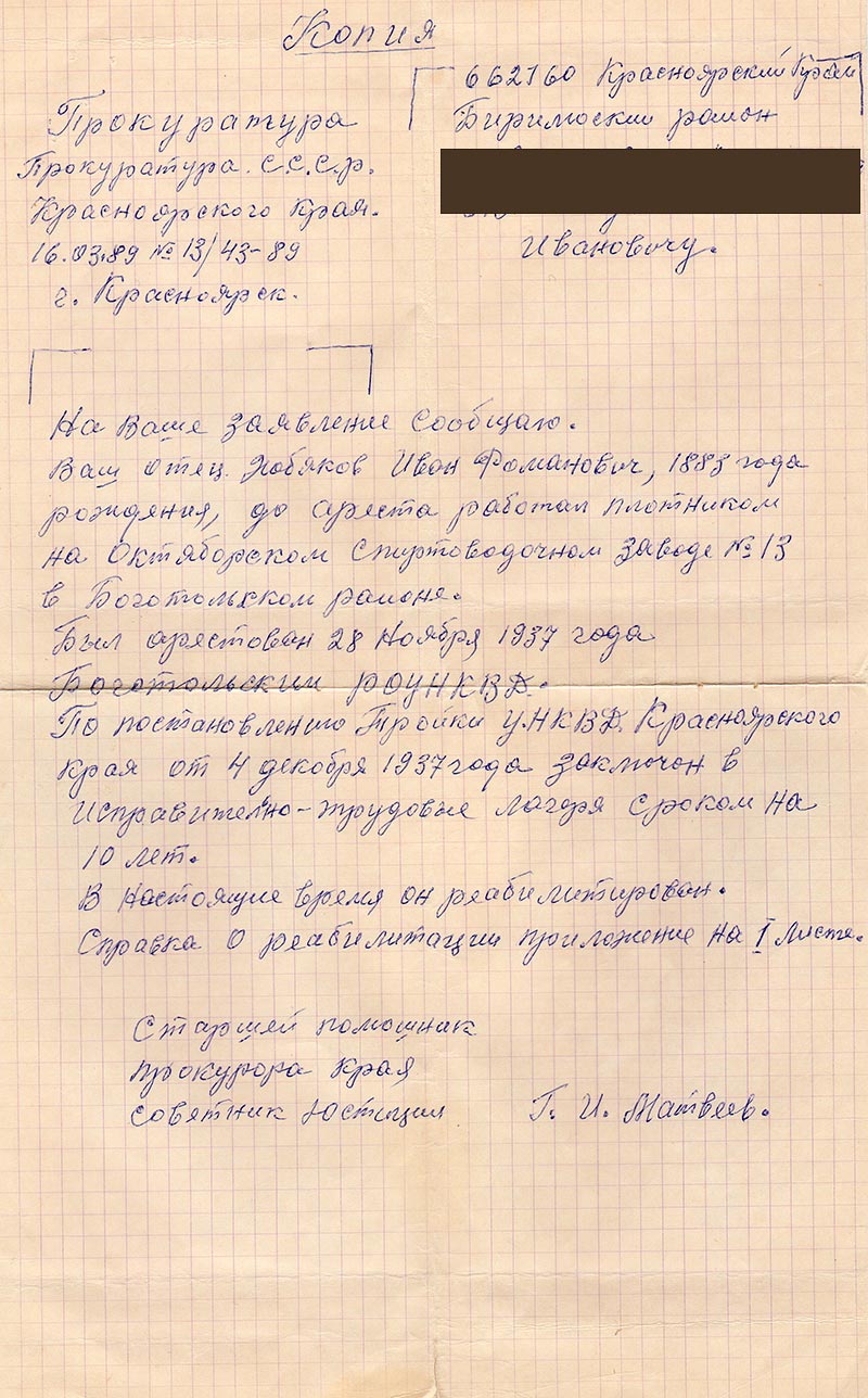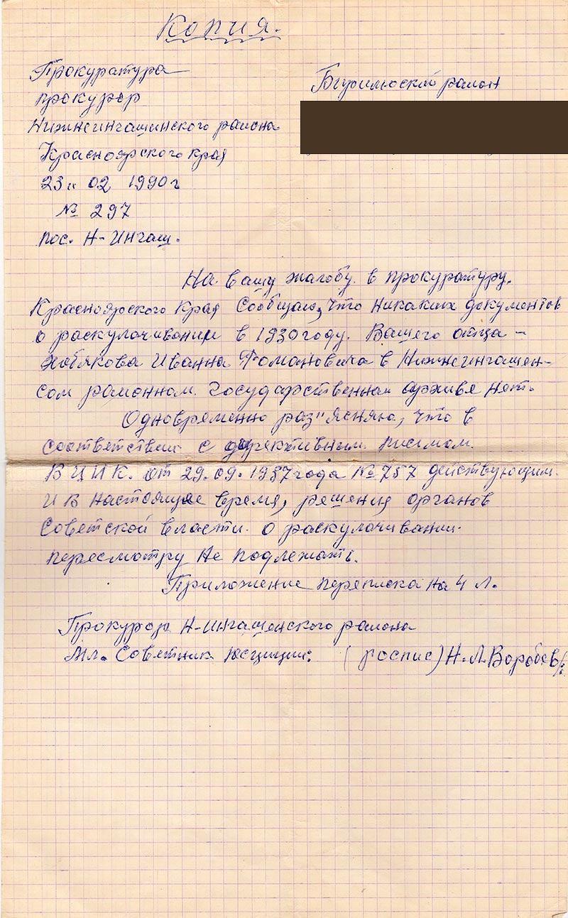 На вашу жалобу в прокуратуру Красноярского края сообщаю, что никаких документов о раскулачивании в 1930году Вашего отца - Хобякова Иванна Романовича в Нижнеингашенском раионном Государственном архиве нет.
