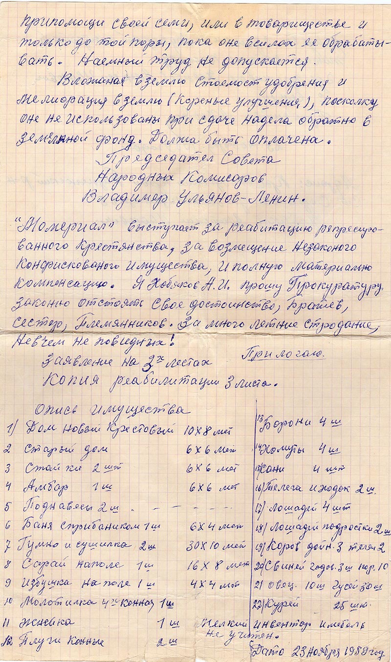 «Момериал» выступает за реабитацию репресированного крестянства, за возмещение незаконого конфискованого имущества, и полную материально компенсацию. Я Хобяков А.И. прошу Прокуратуру законно отстоять Свое достоинство, Братев, Сестер, Племянников. За много летние стродание, невчем не повинных!