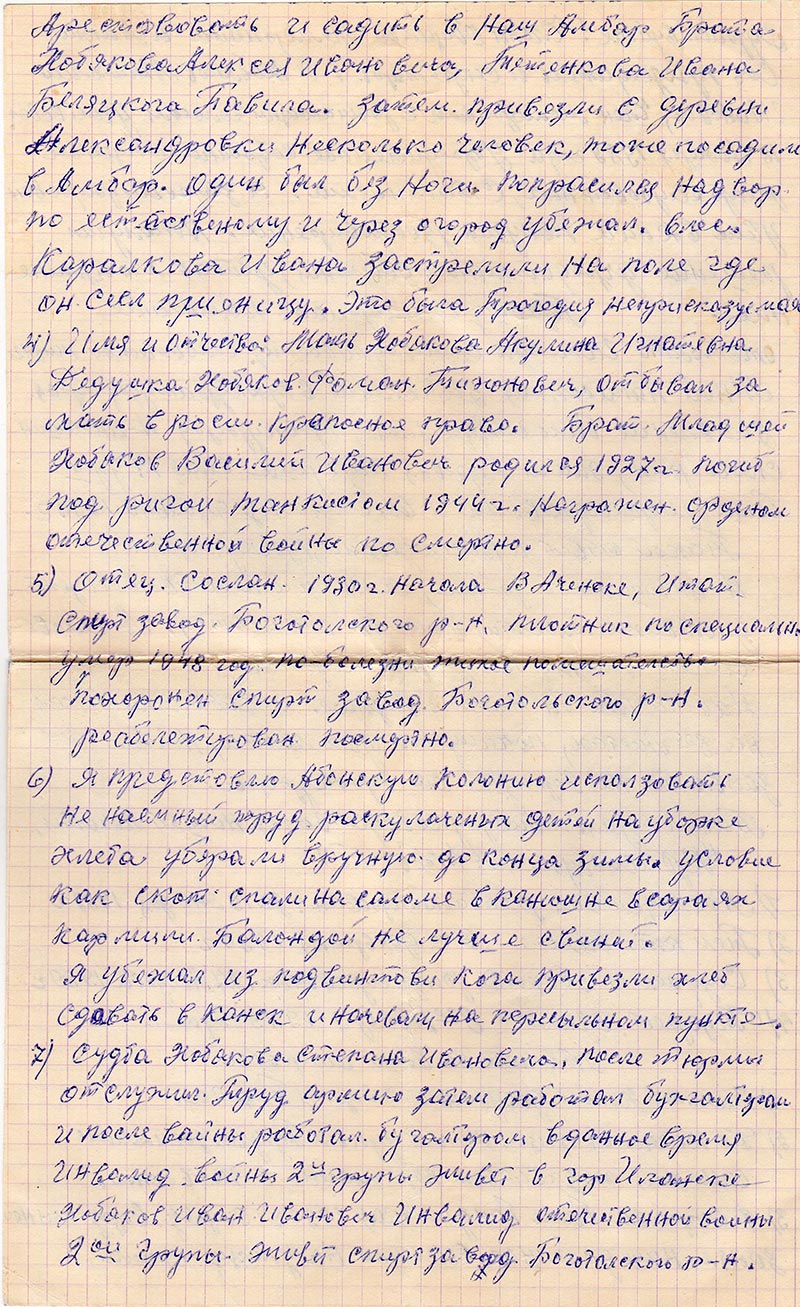 Нас выгнали на улицу. Стали Арестововать и садить в наш Амбар Брата Хобякова Алексея Ивановича, Тетенкова Ивана, Беляцкога Павила. Затем привезли с деревни Александровки несколько чеорвек, тоже посадили в Амбар. Один был без ноги. Попросился надвор по естественому и через огород убежал.в лес. Каралкова Ивана застрелили на поле где он сеел пшеницу. Это была Трогедия неприсказуемая.