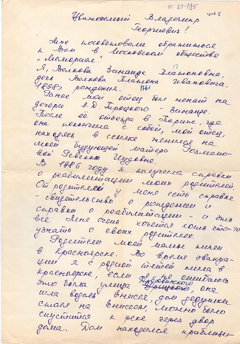 В 1986 году я получила справки о реабилитации моих родителей. От родителей у меня есть справка-свидетельство о рождении и справки о реабилитации – и это все. Мне очень хочется хоть что-то узнать о своих родителях.