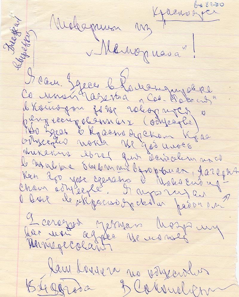 Я сам здесь в командировке. Со мной газета «Сов. Россия» в которой тоже говорится о репрессированных (обществе). Но здесь в Красноярском Крае общество пока не добилось никаких льгот для оставшихся в живых бывших в тюрьмах, лагерях как это уже сделано в Новосибирском обществе. Я прочитал о вас в «Красноярском рабочем».