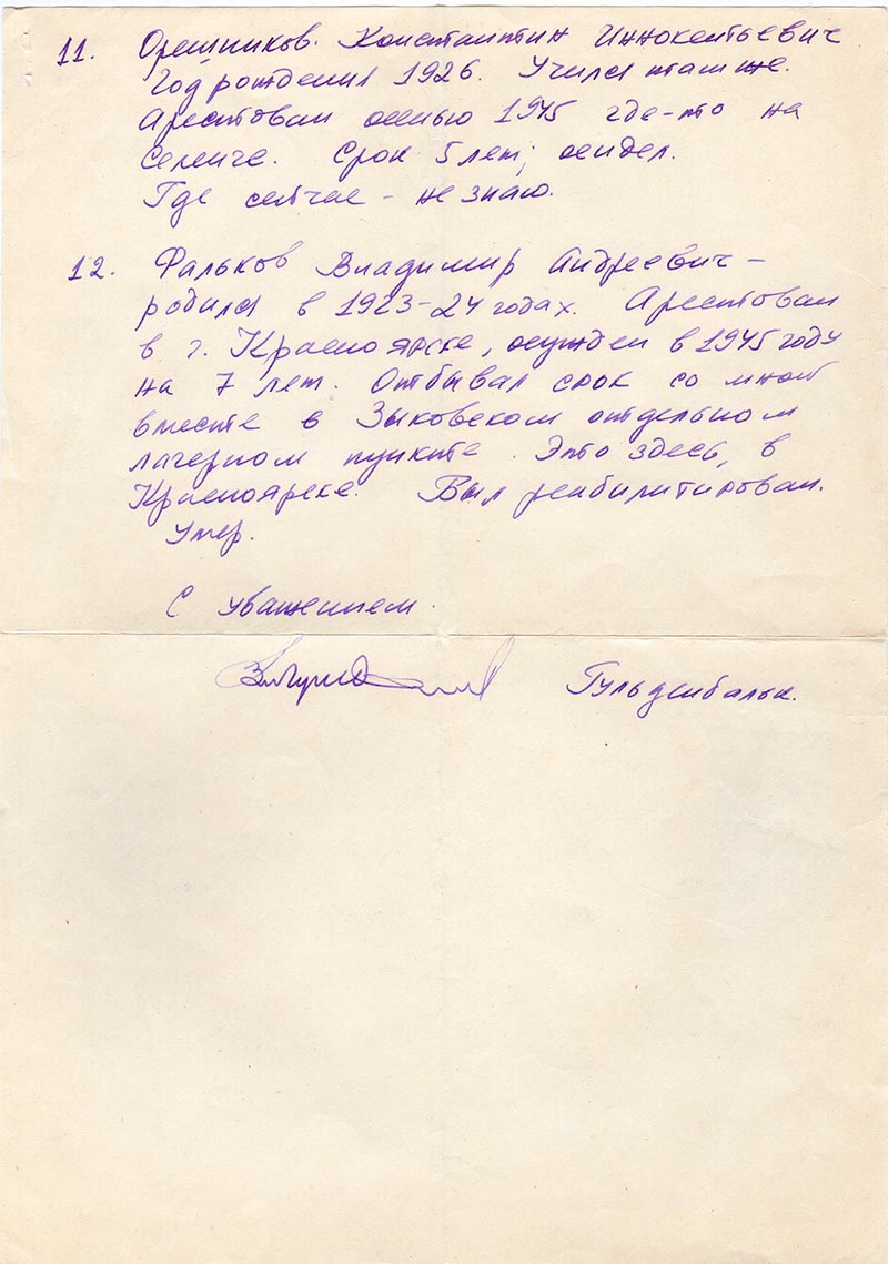 12. Фальков Владимир Андреевич- родился в 1923-24 годах. Арестован в г. Красноярске, осужден в 1945 году на 7 лет. Отбывал срок со мной вместе в Зыковском отдельном лагерном пункте. Это здесь, в Красноярске. Был реабилитирован. Умер.