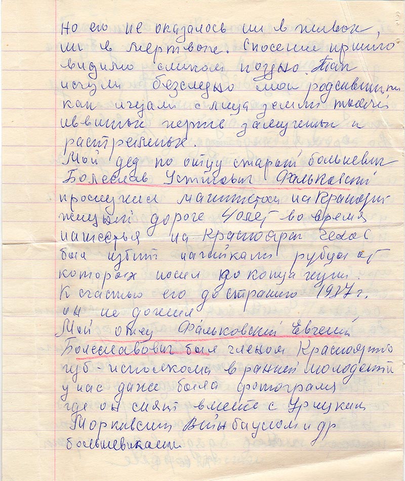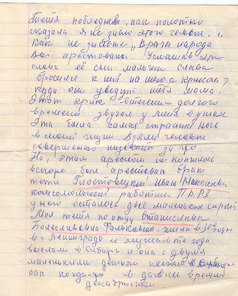 Этот крик втечении долгого времени звучал у меня в ушах. Эта была самая страшная ночь в моей жизни. Взяли человека совершенно низвестно за что. Но, этим арестом не кончилось вскоре был арестован брат тети Глостовецкий Иван Максимвч комсомольский работник П.В.Р.З. у него осталось двое маленьких сирот.