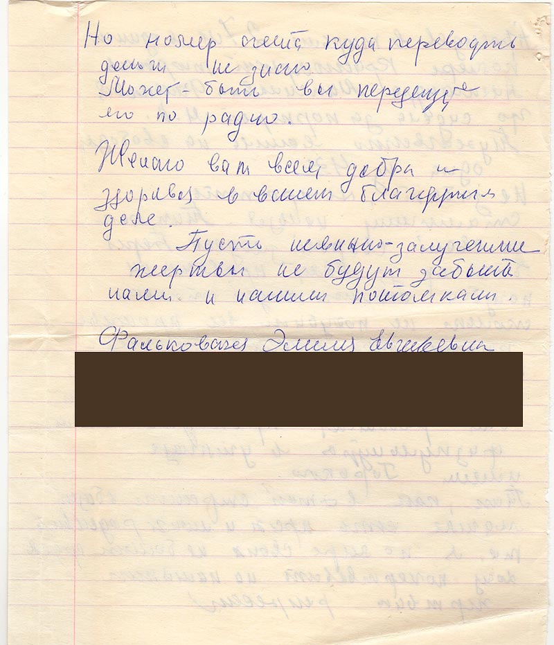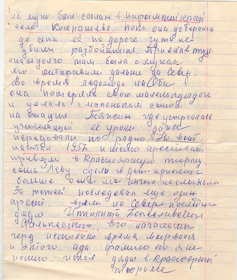 Её муж был сослан в Нарымский край село Колпашево. Пока она добиралась до села её по дороге чуть не убили разбойнике. Приехав туда она не долго там была с мужем его отправили дальше на север. Во время ледохода на Оби она потеряла свою маленькую дочь и уехала с маленьким сыном на стацию Тяжин где устроилась учительницей её уроки даже передавали по радио. Но вот настал 1937 г. тетю арестовали привезли в Красноярскую тюрьму. Сына Леву сдали в дет-приемник больше о нем мы ничего не слышали. За тетей последовал еще один арест. Взяли на Севере последнего дядю Ипполита Болеславовоча Фальковского. Его начальник через несколько время вырвался и этого ада фамилию его я не помню. Искал дядю в Красноярской тюрьме но его не оказалось ни в живых, ни в мертвых. Спосение пришло видимо слишком поздно. Так исчезли безследно мои родственники как исчезали с лица земли тысячи невинных жертв замученных и растреленных.