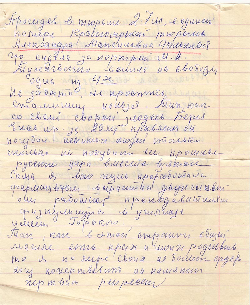 Просидев в тюрьме 27 лет в одиночной камере Красноярской тюрьмыАлександра Макслилавна Фалькивя что сидела за портрет М.И. Тухачевского вышла на свободу одна из 4х.
