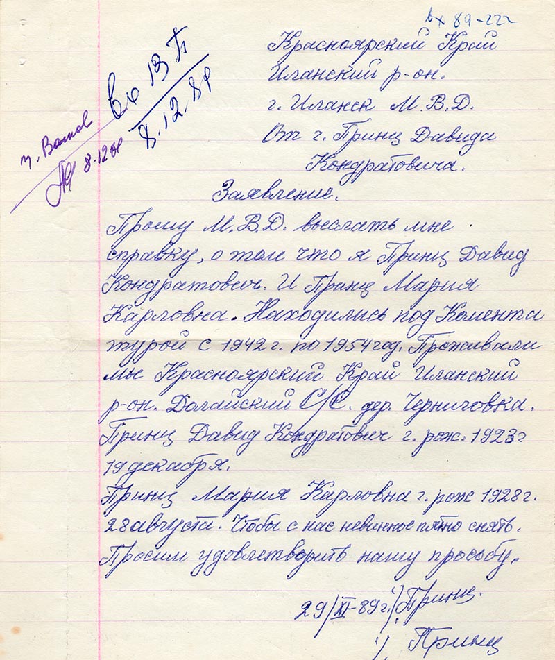 Прошу М.В.Д. выслать мне справку, о том что я Принц Давид Кондратович. И Принц