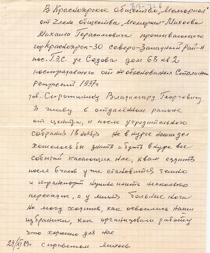 В Красноярское общество «Мемориал» от члена общества «Мемориал» Михеева