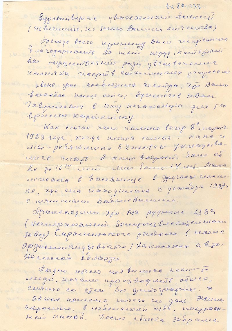Как сейчас ясно помню вечер 8-е марта 1938 года, когда наша семья: папа и мы – ребятишки 5 человек укладывались спать. А наш возраст был от 2х до 16ти лет. Мне было 14 лет Мама лежала в больнице в другом поселке, где она находилась с декабря 1937 г. с тяжелым заболеванием.