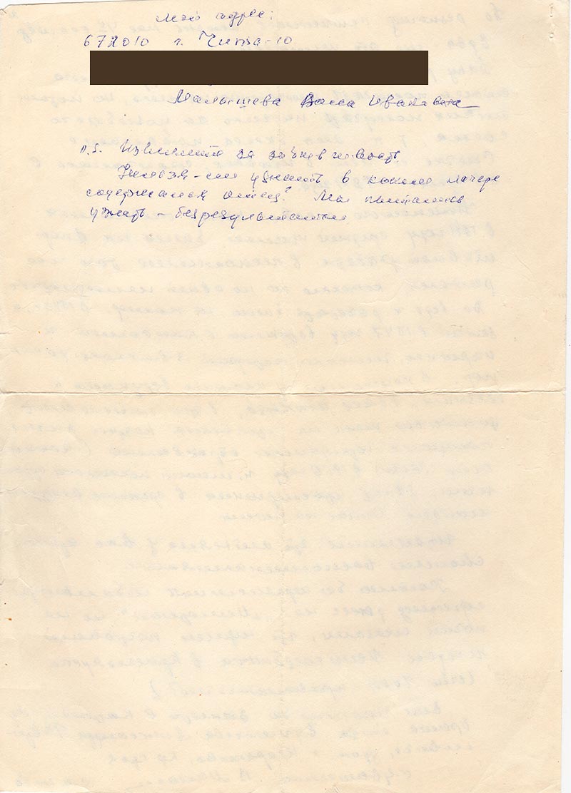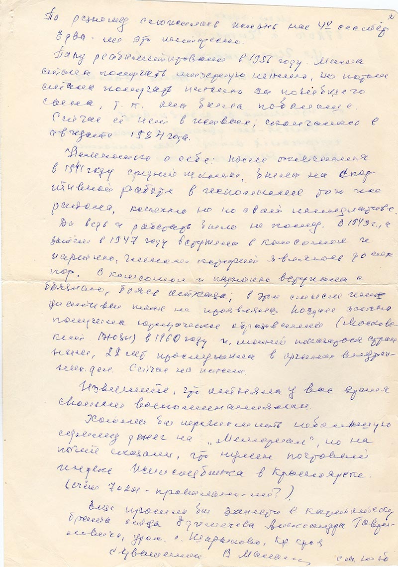 Немножко о себе: после окончания в 1941 году средней школы, была на спортивной работе в исполкоме того же района, конечно не по своей инициативе. Да ведь и работать было не кому. В 1943 г., а затем в 1947 году вступила в комсомол и партию, членом которой являюсь до сих пор. В комсомол и партию вступала с боязнью, боясь отказа, в этом смысле инициативы тоже не проявляла, позднее заочно получила юридическое образование (Московский ВЮЗИ) в 1960 году и может показаться странным, 28 лет прослужила в органах внутренних дел. Сейчас на пенсии.