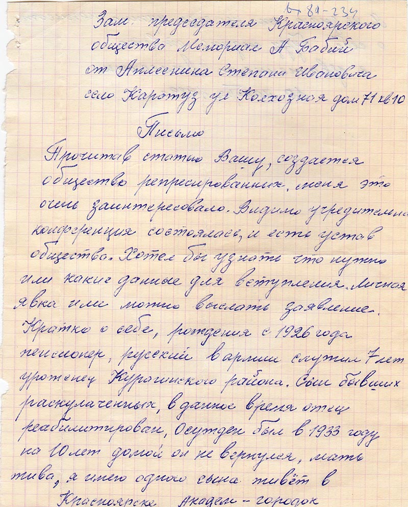 Кратко о себе, рождения с 1926 года пенсионер, русский в армии служил 7 лет уроженец Курагинского района. Сын бывших раскулаченных, в данное время отец реабилитирован, осужден был в 1933 году на 10 лет домой он не вернулся, мать жива, я имею одного сына живёт в Красноярске Академ-городок Я не знаю что еще нужно написать о себе, буду ждать ответа.