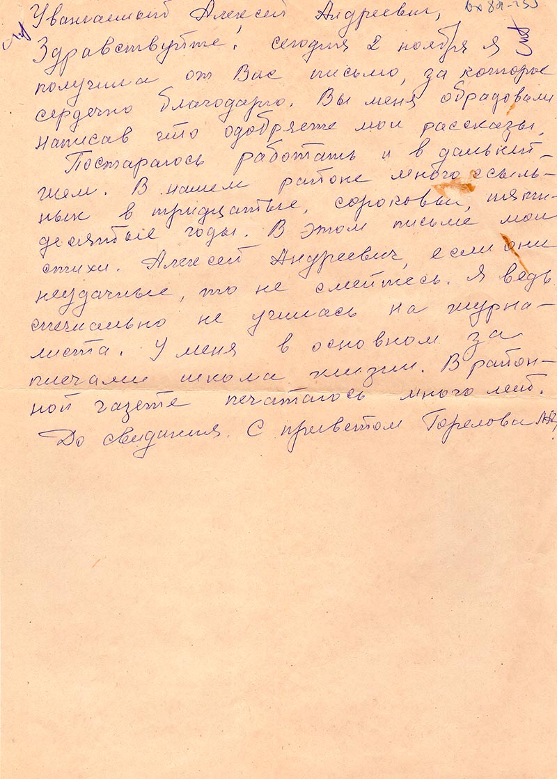Уважаемый Алексей Андреевич, Здравствуйте! Сегодня 2 ноября я получила от Вас письмо, за которое сердечно благодарю. Вы меня обрадовали написав что одобряете мои рассказы.