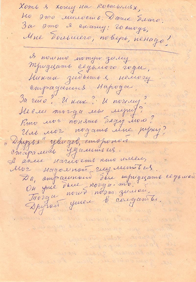 Постараюсь работать и в дальнейшем. В нашем районе много ссыльных в тридцатые, сороковые, пятидесятые годы. В этом письме мои стихи. Алексей Андреевич, если они неудачные, то не смейтесь. Я ведь спечиально не училась на журналиста. У меня в основном за плечами школа жизни. В районной газете печатаюсь много лет.
