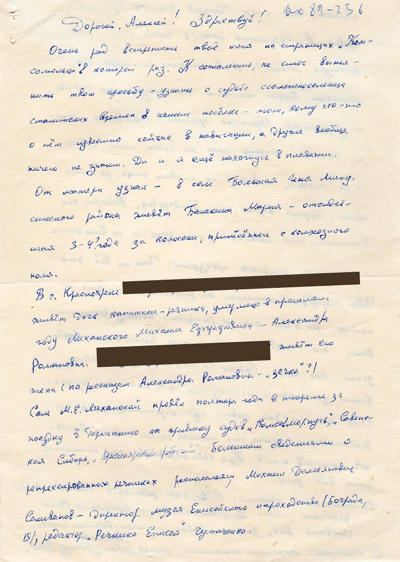 В г. Красноярске *адрес живет дочь капитана-речника, умершего в прошлом году Лиханского Михаила Евграфовича – Александра Романовна. *адрес живет его жена (по рассказам Александры Романовны – «зечка»?).
