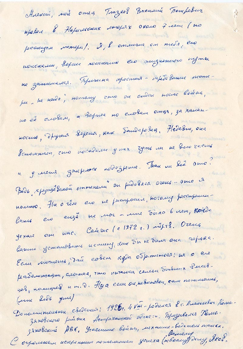Алексей, мой отец Гладков Василий Петрович провел в Норильских лагерях около 7 лет (по рассказам матери). Я, в отличие от тебя, его поисками, вернее поисками его жизненного пути не занимался. Причина простая - требование матери «не надо», потому что он сидел после войны, по ее словам, а вернее по словам отца, за халатность, другая версия, как бандеровец. Недавно, она вспомнила, что посадили у них чуть ли не всю часть и у меня закралось сомнение. Так ли все это? Ведь «хрущевской оттепели» он радовался очень- это я помню. Ни о чем его не распросил, потому расспрашивать еще не мог- мне было 6 лет, когда уехал от нас. Сейчас (с 1972 г.) мертв. Очень важно установить истину, как бы не была она горька. Если можешь, дай куда обратиться: не о его реабелитации, слышал, что пытаются семьи бывших власовцев, полицаев и т.д. Ну а если он, невиновен, сам понимаешь, (мне ведь уже).